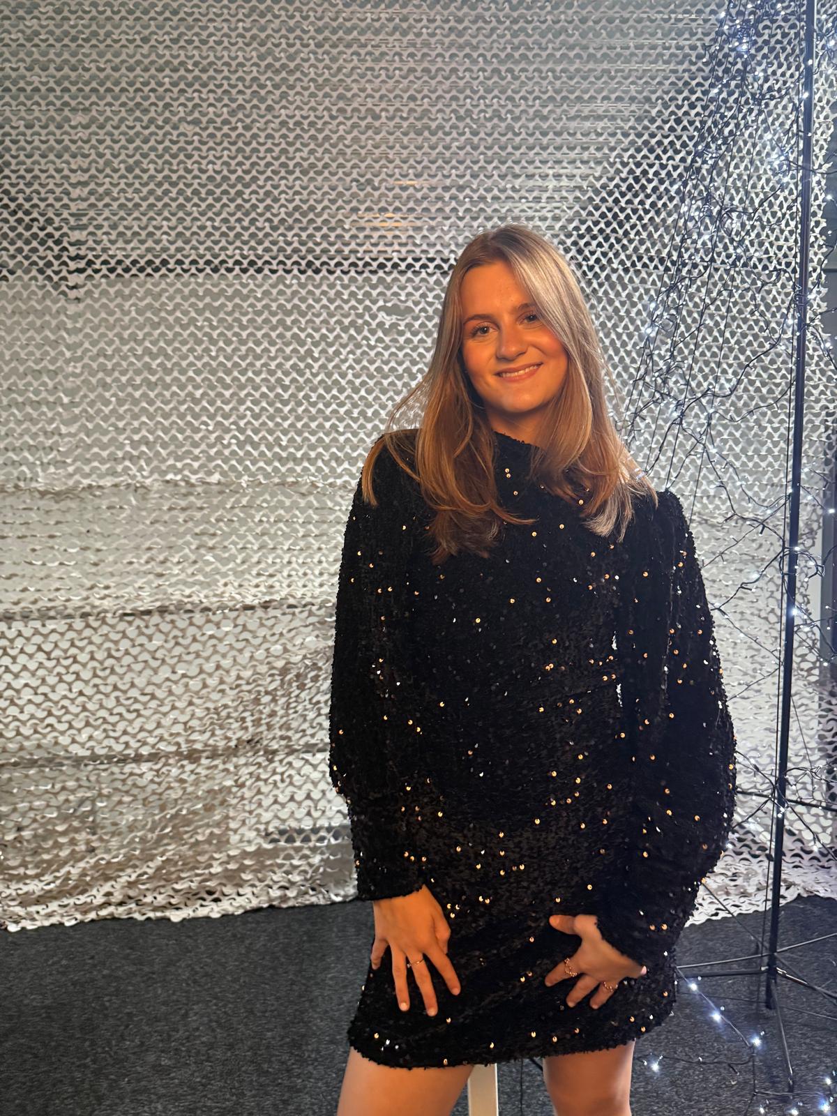 De Maeve Dress is een absolute showstopper voor de feestdagen. Dit glitterjurkje straalt pure elegantie uit met zijn lange mouwen en mooie open rug.